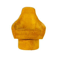 Goldenrod crushed velvet highback swivel chair in the style of Adrian Pearsall. Label on base has the name of a furniture store only- no other maker's marks. Original upholstery with self-fabric covered cylindrical swivel base. Would be an excellent piece to use in set design. Compact size especially given the comfort. In good original condition.