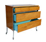 Rolling hospital chest with original turquoise drawer interiors. I believe this is designed by Henry P. Glass. The drawer interiors are metal finished in turquoise, and the cabinet has a steel exoskeleton with walnut-paneled drawers. The top surface is easy-care laminate with a fine grid pattern. The chest is the ideal mix of mid-century modern and industrial, utilitarian and chic. The turquoise drawer interiors add pleasing charm, and the built-in wheels make this piece easy to move.
