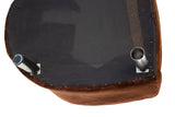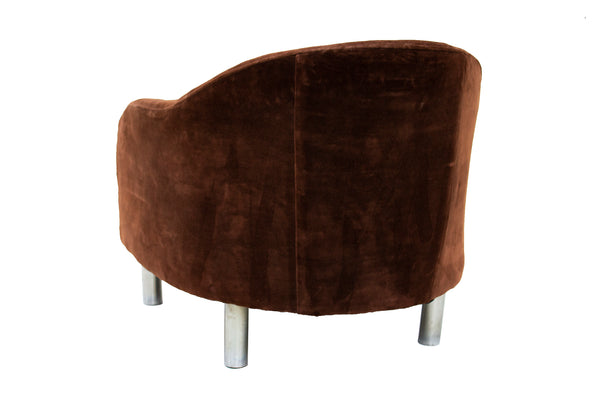 Velvety Brown Barrel Chair by Selig. Cylindrical silver feet, curves that look great from all angles, smaller scale. Very comfortable chair. Note: caps on legs have all been replaced since the photos were taken.